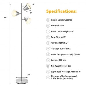 64 Inch 3-Light LED Floor Lamp Reading Light for Living Room Bedroom-Silver – Color: Silver
