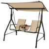 2-Seat Outdoor Cushioned Porch Swing with Adjustable Canopy and Tempered Glass Table-Beige – Color: Beige
