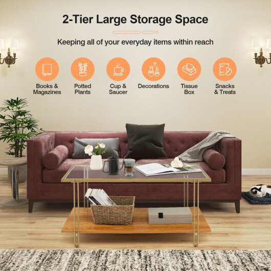 Specifications: Color: Gold Material: Engineered Wood Steel Overall Dimensions: 39.5″ x 20″ x 18″ (L x W x H) Height of the Shelf(From the Ground): 4.5″ Weight Capacity of Tabletop: 132 lbs Weight Capacity of Shelf: 88 lbs Net Weight: 33 lbs Package Includes: 1 x Coffee Table 1 x User Manual