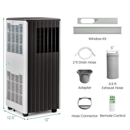Specifications: Color: White + Black/White + Blue/White +Pink Material: ABS Product Dimensions: 12.5″ x 12″ x 28″ (L x W x H) Cooling Capacity (ASHRAE): 10000 BTU Cooling Capacity (SACC): 7100 BTU Power: 944 W Amp: 9.2 A Air Flow Rate: 210 CFM Cooling Area: 350 sq.ft. Voltage: 115V/60Hz Dehumidifying Capacity: 55 Pints/Day Temperature Setting Range: 61?~88? Noise Level: 52-55 dB Applicable Window Width/Height: 25.5″-47″ Length of Exhaust Hose: 4.9 ft Diameter of Exhaust Hose: 5.9″ Length of Drain Hose: 2 ft/ 60 cm Diameter of Drain Hose: Length of Power Cord: 6.1 ft Max Remote Control Distance: 16.5 ft Net Weight: 50 lbs Package Includes: 1 x Portable Air Conditioner 1 x Exhaust Hose 1 x Hose Connector 1 x Adapter 1 x Window Kit 1 x Drain Hose 1 x Remote Control 1 x User Guide