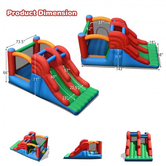 Specifications: Color: Blue + green + red + orange Material: 420D Oxford cloth + 840D oxford cloth+ laminated PVC Product size: 143″ x 73.5″ x 71″ (L x W x H) Net weight: 25.5 lbs Max weight of each kid allowed: 66 lbs Maximum number of children allowed: 3 Suitable age: 3-10 Years Old Recommend blower: 735W Blower Package includes: 1 x Inflatable bouncer house 1 x Carrying bag 1 x Repairing kit 6 x Bouncer stakes 1 x Instruction