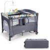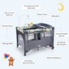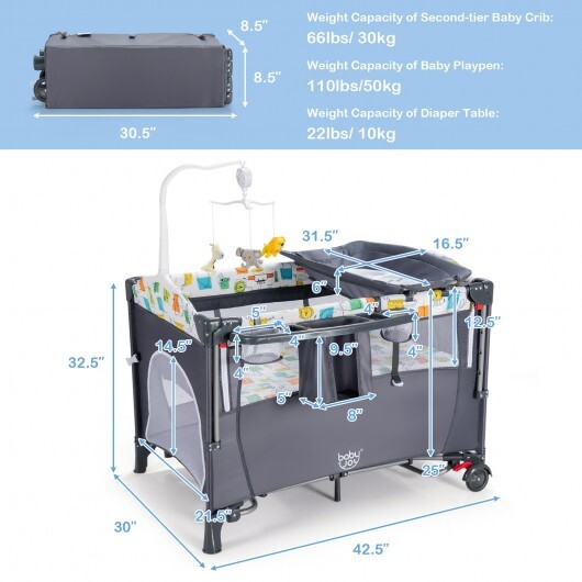 Specifications: Color: Black/Gray Material: Iron 210D Oxford cloth PP Overall product dimension: 43″ x 29.5″ x 32.5″ (L x W x H) Folding size: 30.5″ x 8.5″ x 8.5″ (L x W x H) Diaper table size: 31.5″ x 16.5″ x 6″ (L x W x H) Net weight: 27.5 lbs Maximum weight of basic playpen: 33 lbs Maximum weight of second layer: 22 lbs Maximum weight of diaper table: 22 lbs Recommended age: 0-36 months Package includes: 1 x 5-in-1 Baby nursery center 1 x Storage tray 1 x Music and toy rack 1 x Diaper changing table 1 x Mattress 1 x Safety strap 2 x Rocking tubes 1 x User manual