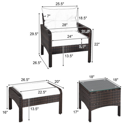 Specifications: Color: Red/Turquoise/Beige Material of furniture set: Rattan steel and glass Material of cushion: Polyester fabric 24 D sponge and cotton Size of ottoman: 26.5″ x 20″ x 16″ (L x W x H) Size of single sofa: 28″ x 26.5″ x 29.5″ (L x W x H) Size of tea table: 18″ x 18″ x 16.5″ (L x W x H) Thickness of table top glass: 5 mm Thickness of seat cushion: 3.1″ Max loading weight capacity: 250 lbs Package includes: 2 x Single sofas 2 x Footstools 1 x Tea table Seat and back cushions for sofa