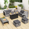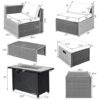 Specifications: PE Rattan Color of Patio Sofa Set: Mix Gray PE Rattan Color of Fire Pit Table: Black Color of Cushions: Black/Gray/Navy/Red/Turquoise/Off White Material: PE Rattan Steel Tempered Glass Polyester Sponge Ceramic Heat Output: 60 000 BTU Overall Dimension of Fire Pit Table: 42″ x 20″ x 25″ (L x W x H) Overall Dimension of Coffee Table: 39.5″ x 20″ x 13.5″ (L x W x H) Overall Dimension of Storage Box: 33.5″ x 29.5″ x 26″ (L x W x H) Overall Dimension of Each Ottoman: 17.5″ x 17.5″ x 16″ (L x W x H) Overall Dimension of Each Corner Sofa: 29.5″ x 29.5″ x 25.5″ (L x W x H) Overall Dimension of Each Armless Sofa: 28″ x 27″ x 25″ (L x W x H) Dimension of Each Ottoman’s Cushion: 17.5″ x 17.5″ x 4″ (L x W x Thickness) Dimension of Each Corner Sofa’s Back Cushion: 26″ x 14″ x 7″ (L x W x Thickness) Dimension of Each Corner Sofa’s Seat Cushion: 25″ x 25″ x 4″ (L x W x Thickness) Dimension of Each Armless Sofa’s Back Cushion: 27.5″ x 14″ x 7″ (L x W x Thickness) Dimension of Each Armless Sofa’s Seat Cushion: 27″ x 25″ x 4″ (L x W x Thickness) Overall Dimension of Full Storage: 93″ x 29.5″ x 26″ (L x W x H) Seat Height from the Ground for Each Corner Sofa: 12.5″ Seat Height from the Ground for Each Armless Sofa: 13.5″ Net Weight of Fire Pit Table: 65.5 lbs Net Weight of Coffee Table: 23 lbs Net Weight of Storage Box: 22 lbs Net Weight of Each Ottoman: 10 lbs Net Weight of Each Corner Sofa: 20 lbs Net Weight of Each Armless Sofa: 18 lbs Weight Capacity of Fire Pit Table: 220 lbs Weight Capacity of Coffee Table: 165 lbs Weight Capacity of Each Ottoman: 350 lbs Weight Capacity of Each Corner Sofa: 350 lbs Weight Capacity of Each Armless Sofa: 350 lbs