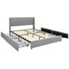 The bed frame is fully filled with sponge and covered with linen fabric which highly improve the softness. Also it has four large rolling drawers where you can store many clothes bed sheets toys pillows and so on. The whole frame is made of steel and it also comes with ample slats both realizing a strong load capacity of 660 lbs as well as sufficient support for your mattress without a box spring. As a reminder the recommended thickness is 8″-12″. When you lie on it and turn it over you will find there are few noises. Because an included mute bar greatly reduces frictions between slats and frame. Anti-slip and adjustable pads enhance overall stability for a wobble-free position. Finally you can install all slats only by your hands saving much time and effort.