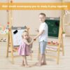 Specifications: Color: Nature grey Material: Monterey pine MDF Storage tray Size: 18″ x 16.5″ (L x W) Board size: 15.5″ x 14″ (L x W) Overall dimension:20″ x 21″ x 31- 41″ (L x W x H) Adjustable height of each gear: 2.5″ Net weight: 8 lbs Suitable age: Over 3 years old Certification: ASTM and CPSIA Package includes? 1 x Kids easel 1 x Eraser 2 x Chalk 2 x Iron clips 3 x Whiteboard pens 3 x Paint cups 1 x 16.5 ft drawing paper 1 x Instruction