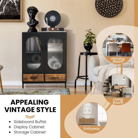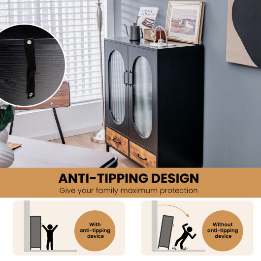 It has a 2-tier storage cabinet and 2 deep drawers that can sort and hide a variety of sundries. Besides the spacious countertop is ideal for displaying your favorite ornaments photo frames and vases. Thus the cabinet can be used as a buffet sideboard display cabinet storage cabinet according to your different needs. The industrial appearance and corrugated tempered glass doors make it stylish and eye-catching. Besides a durable and rustproof steel frame ensures long-lasting service life. The strong load capacity and anti-topping device allow you to store items with confidence. Furthermore a waterproof surface and 4″ ground clearance make cleaning a breeze for you.