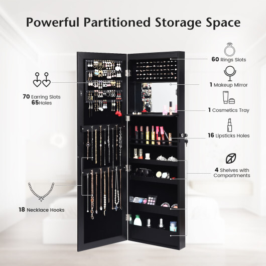 - 5 lined shelves designed for holding earrings 18 hooks 60 ring slots 1 make-up mirror 16 lipstick slots 4 storage shelves