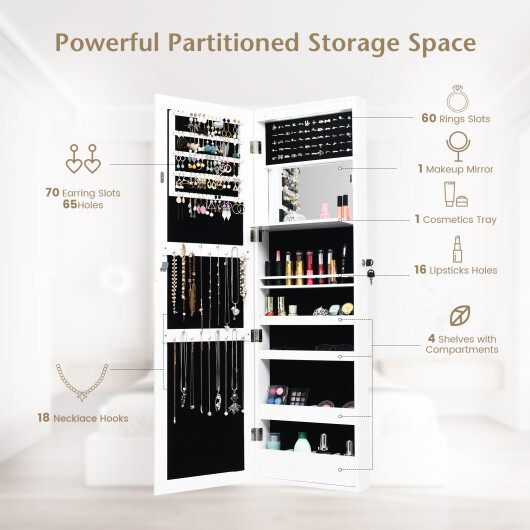 - 5 lined shelves designed for holding earrings 18 hooks 60 ring slots 1 make-up mirror 16 lipstick slots 4 storage shelves