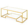 Specifications: Color: Black Material: Tempered glass steel Overall dimension: 42″ x 19.5″ x 18″(L x W x H) Size of bottom shelf: 23.5″ x 19.5″(L x W) Net weight: 33.5 lbs Weight capacity of tabletop: 200 lbs Weight capacity of shelf: 44 lbs Color: Gold Material: Steel Tempered Glass Product Size: 45″ x 20″ x 17″ (L x W x H) Clearance Between 2 Tier: 12″ Lower Shelf Size: 24″ x 20″(L x W) Space Under the Lower Shelf: 22″ x 20″ x 3.5″ (L x W x H) Weight Limit of Tabletop: 110 lbs Weight Limit of Lower Shelf: 66 lbs Net Weight: 35 lbs Package includes: 1 x Tempered glass coffee table 1 x User guide