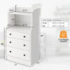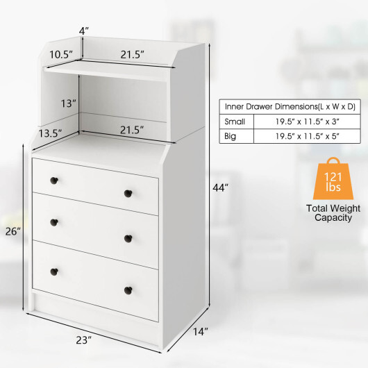 Specifications: Specification Color White/Black/Walnut Material Engineered Wood Overall Dimensions 23″ x 14″ x 44″ Size of Top Shelf 21.5″ x 10.5″ x 4″ Size of Countertop 21.5″ x 13.5″ x 13″ Countertop Height from Floor 26″ Small Drawer Dimensions 19.5″ x 11.5″ x 3″ Big Drawer Dimensions 19.5″ x 11.5″ x 5″ Total Weight Capacity 121 lbs Net Weight 69.5 lbs