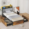 Specifications: Color Rustic Brown Materials MDF Metal Linen Sponge Twin Overall Dimensions 81.5″ x 42″ x 39.5″ Platform Dimensions 75″ x 39″ Interior of Drawer 30″ x 20″ x 5″ Weight Capacity 880 lbs Net Weight 90.5 lbs Full Overall Dimensions 81.5″ x 56.5″ x 39.5″ Platform Dimensions 75″ x 54″ Interior of Drawer 30″ x 20″ x 5″ Weight Capacity 880 lbs Net Weight 105 lbs Queen Overall Dimensions 86.5″ x 63″ x 39.5″ Platform Dimensions 80″ x 60″ Interior of Drawer 30″ x 20″ x 5″ Weight Capacity 880 lbs Net Weight 112.5 lbs AC Outlets 125V/12A USB Ports 5V/2.1A Power Cord Length 5 ft