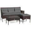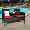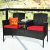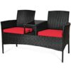 Specifications: Color of rattan: Black Cushion cover color: White/turquoise Overall dimension: 54.5″ x 24.0″ x 33″ (L x W x H) Net weight: 31 lbs Weight capacity of each seat: 355 lbs Table weight capacity: 65 lbs